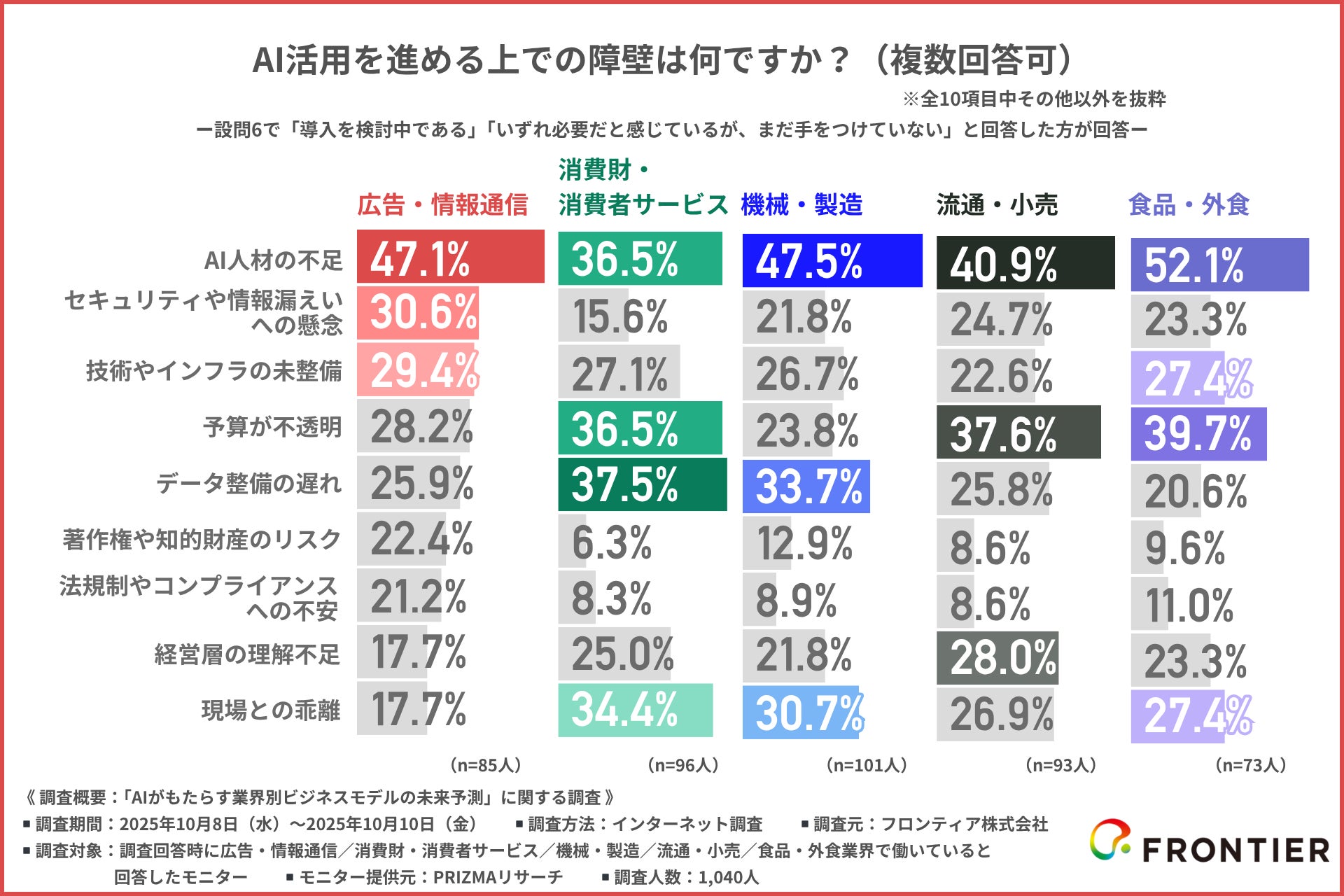 たとえば、食品・外食や製造業では専門人材の確保が難しい一方で、広告・情報通信業ではセキュリティや知的財産への懸念が高いなど、AI導入を進める上での障壁は業種によって性質が異なります。