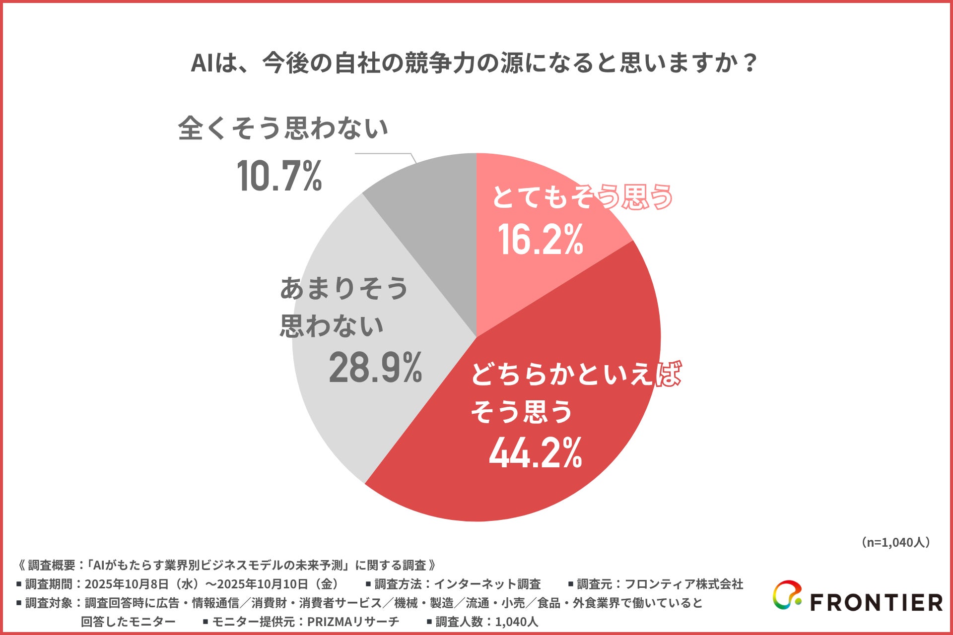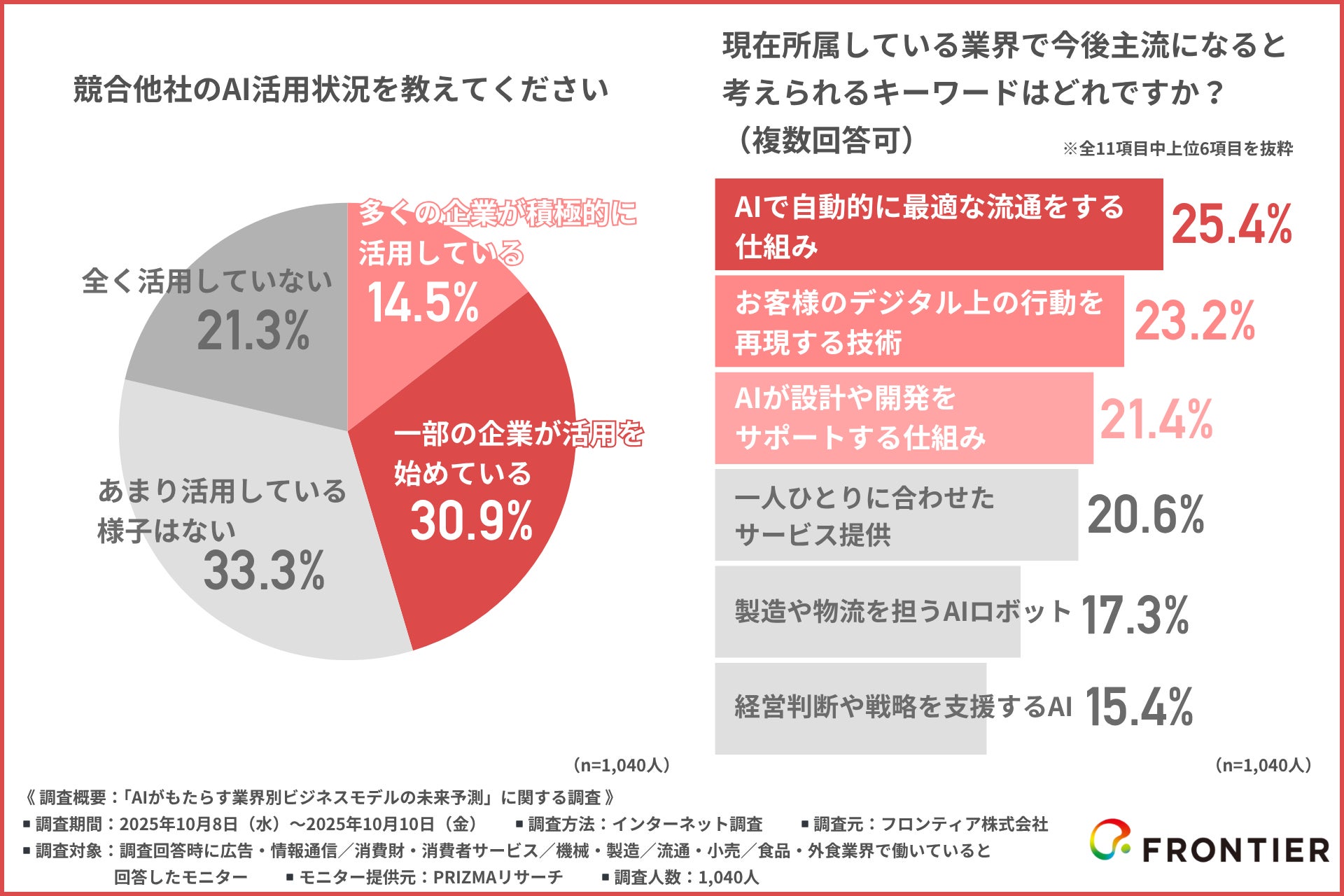 フロンティア株式会社(本社:東京都渋谷区、代表取締役社長:高橋 政裕)は、広告・情報通信、消費財・サービス、機械・製造、流通・小売、食品・外食の5業界で働く1,040名を対象に、「AIがもたらす業界別ビジネスモデルの未来予測」に関する調査を実施しました。