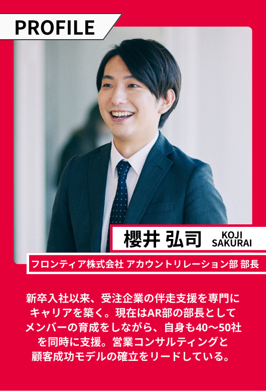 新規開拓を担うSL(ソリューション営業部)が獲得した契約を、一過性の商談で終わらせず、伴走支援を通じて継続的な受注という実利へ結びつけるのがARの役割です。櫻井氏は、AR部門を統括するにあたり、メンバーに繰り返し説いている哲学があります。