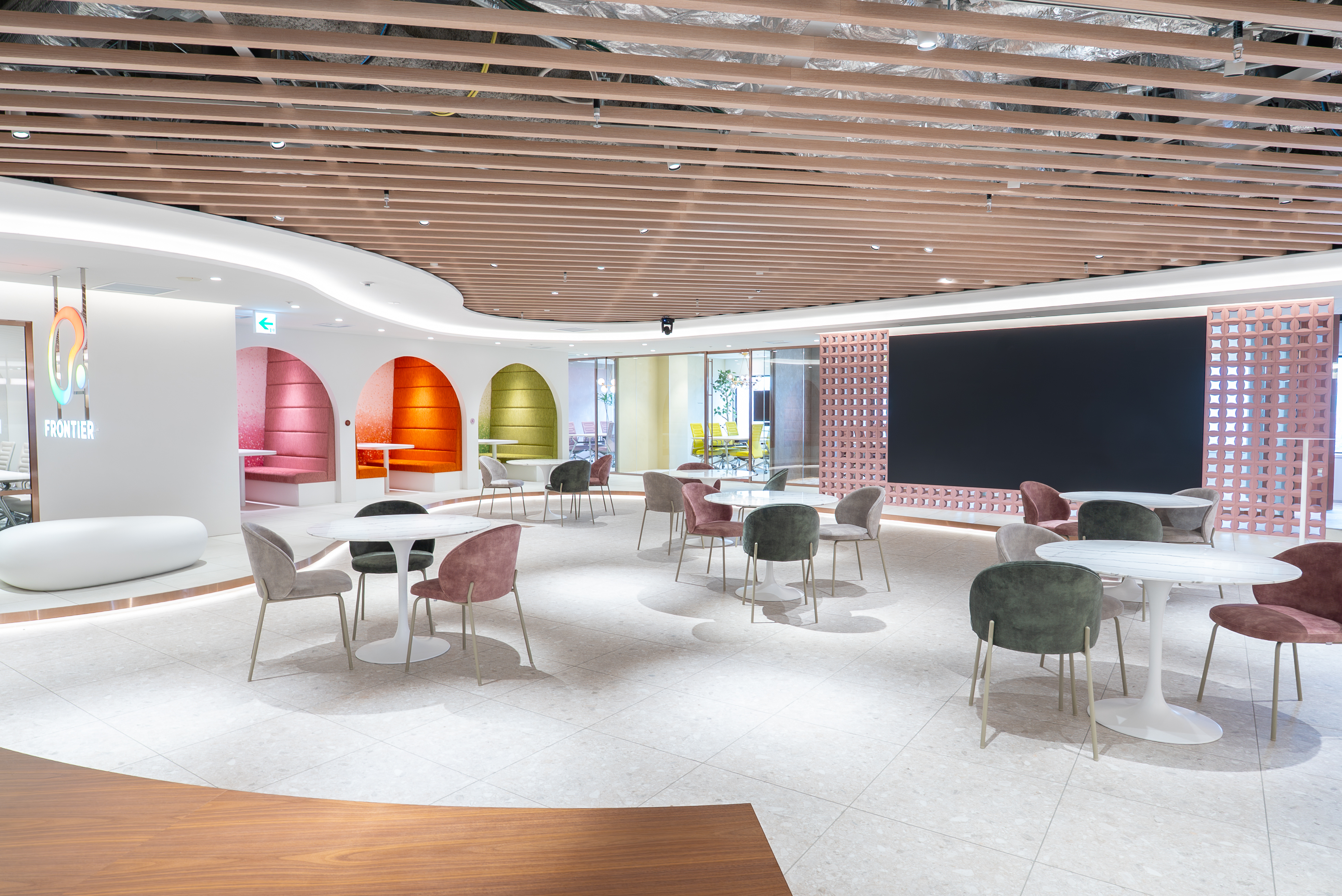 2.オフィスデザインの核となるのは、人との繋がり(コミュニティ)を彷彿とさせる「輪」をベースにした曲線的な設計です。これは「企業や一人ひとりの想いをカタチにし、繋げたい」という理念を象徴するコーポレートロゴを模した作りとなっており、空間そのものが企業のアイデンティティを体現しています